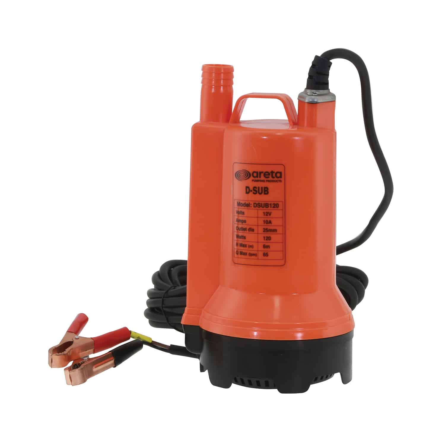 240-DSUB-12012ARETA Submersible Pump 12v DC 120w 10A with Battery Clips